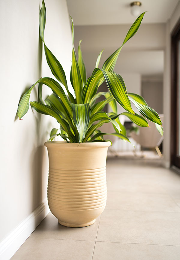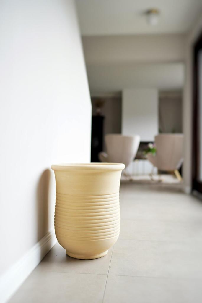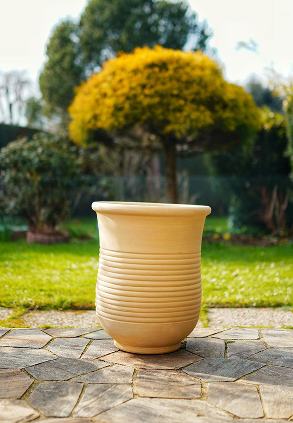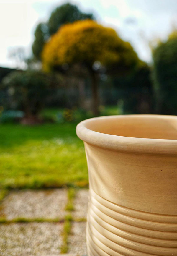 Topf aus gebranntem Ton (Terracotta), handgefertigt, hochwertig, schlicht, elegant, für Innen- und Aussenbereich geeignet.
